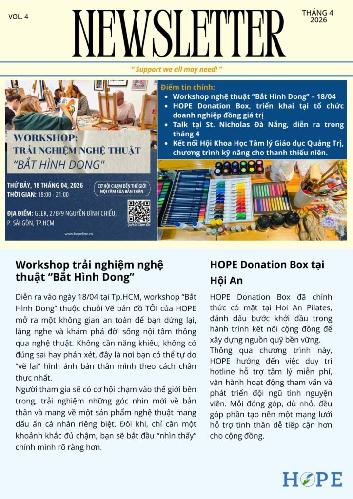 Tại HOPE, chúng tôi tin rằng mỗi đóng góp – dù nhỏ đến đâu – đều có sức mạnh tạo ra thay đổi ý nghĩa. Một hành động tử tế hôm nay có thể trở thành phao cứu sinh cho ai đó đang cần, trở thành nguồn động viên cho người đang gặp khó khăn, hoặc tiếp thêm nguồn lực để HOPE tiếp tục mang các chương trình hỗ trợ tinh thần đến cộng đồng.