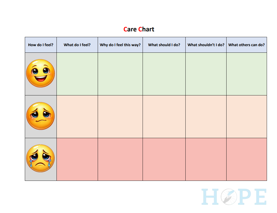 Bảng Chăm Sóc Cảm Xúc (Care Chart) là công cụ hỗ trợ nhận diện và quản lý cảm xúc một cách trực quan và dễ sử dụng. Sản phẩm giúp người dùng xác định cảm xúc hiện tại, hiểu nguyên nhân của cảm xúc đó, đồng thời gợi ý các hành động phù hợp và những điều nên tránh.