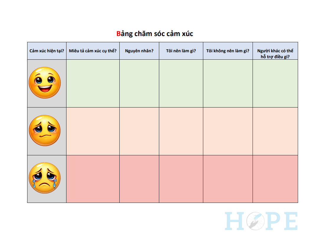 Bảng được thiết kế theo dạng biểu đồ với các mức cảm xúc khác nhau, kết hợp biểu tượng minh họa rõ ràng, giúp việc quan sát và ghi chú trở nên thuận tiện. Nội dung bảng bao gồm các câu hỏi định hướng như: cảm xúc đang trải qua, lý do hình thành cảm xúc, hành động nên thực hiện và sự hỗ trợ từ những người xung quanh.
